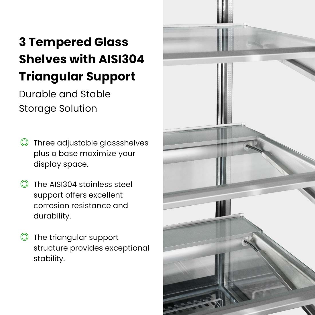 • 3 Tempered glass shelves with AISI304 triangular support