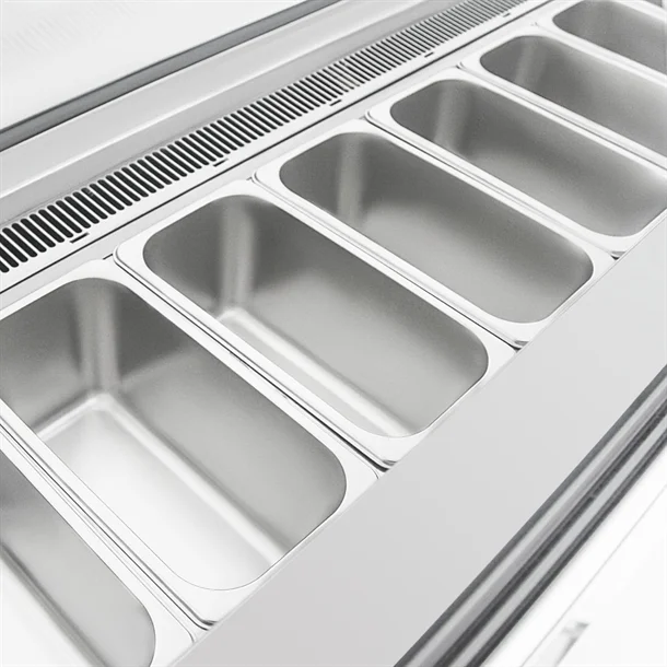 On top, the glass display area allows customers to easily see and choose from your delicious offerings, enticing them with every scoop. Vibrant LED lighting Illuminates your ice cream, enhancing visibility and highlighting the rich colors of your frozen delights. To the rear, convenient rear sliding doors conserve energy, whilst still enabling easy access, making restocking and serving a breeze.